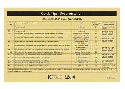 This handy reference guide helps dementia care staff remember the six Allen levels and modes and the translation into level of assist. Laminated for durability, this valuable assessment tool includes tips for documentation.